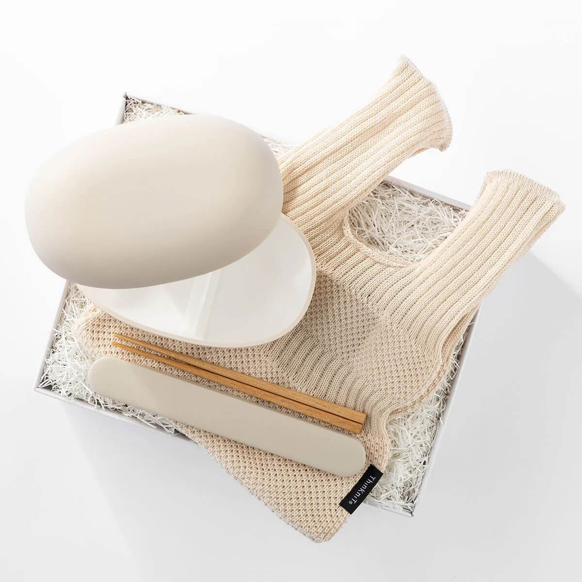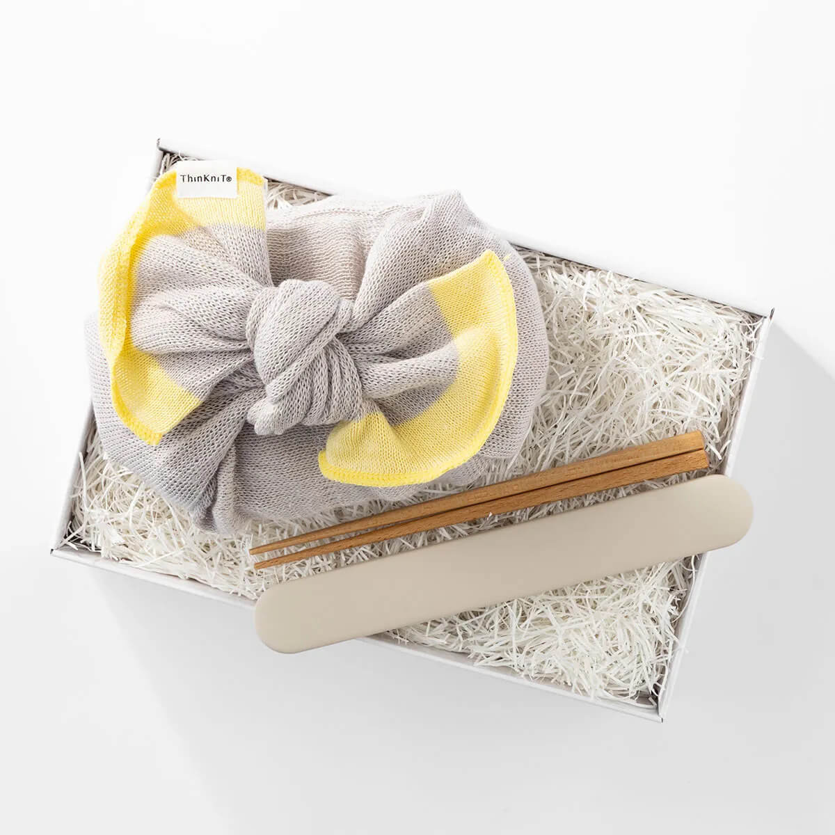 繭をモチーフにした丸みのある『ランチボックス』と、おそろいの『お箸セット』、ニットの伸縮を活かした『お弁当つつみ』のセットです。ランチボックスはドーム型のフタを採用しており、多少おかずを詰めすぎた場合でもスムーズに閉められます。電子レンジ・食洗機対応でBPAフリー素材を使用するなど、機能性・安全性にも配慮しています。お箸箱はスライド式で分解でき、衛生的に使用できます。
