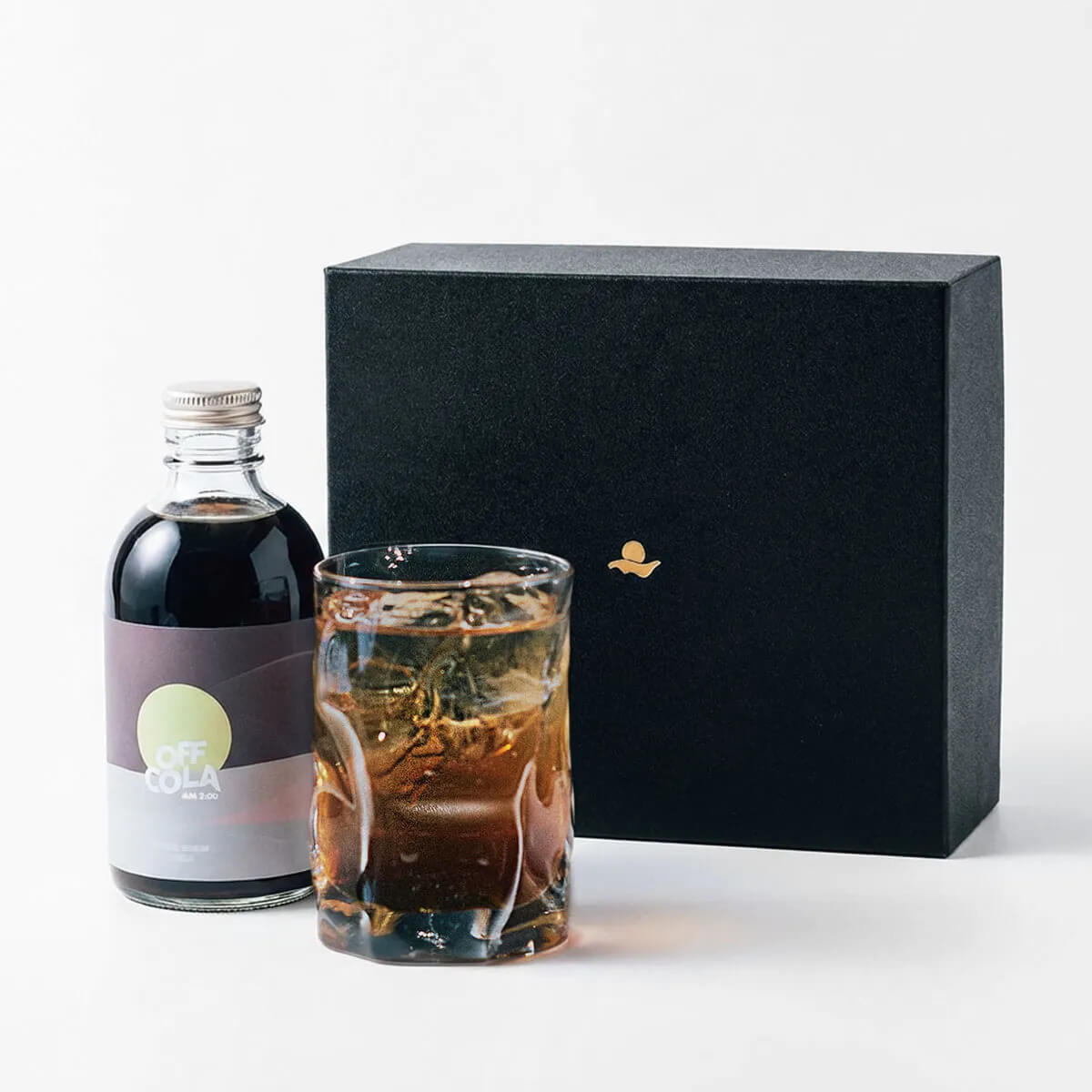 「ふっと一息つく、あなたのオフタイムに」をコンセプトに、SNSやテレビでも話題を呼んでいる〈OFF COLA〉。深夜2時をイメージしたクラフトコーラシロップ「am2:00」と、特製グラス・マドラーをシックな黒化粧箱に収めたギフトセットです。特製グラスは、透き通るようなガラスにゆらぎを持たせたフォルム。〈OFF COLA〉のオフタイムの世界観を、そのまま形にした一客です。