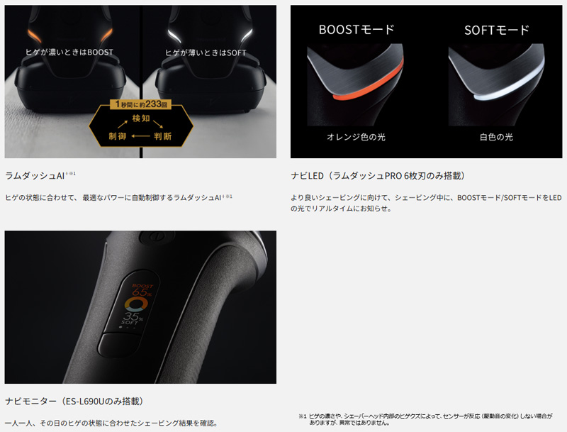 ヒゲの濃さをラムダッシュAI+※1が検知し、パワーを自動制御。BOOSTモード(オレンジ色)とSOFTモード(白色)をLEDの光でお知らせ。 | ES-L690U ES-L670U ES-L650U ES-L650D |