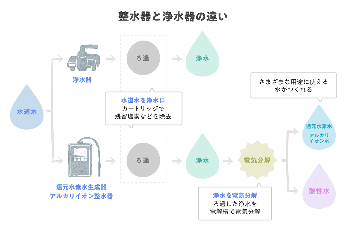 浄水器は、水道水に含まれる残留塩素やその他の不純物を除去する用途で使用されます。整水器は、浄水機能に加えて電気分解によって水素を含むアルカリ性の水や、酸性水をつくることができます。
