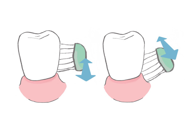 「最初は、磨き残しの多い奥歯からスタートしてください。歯面〜歯周ポケットまで磨けるよう、一つの歯を磨くときにバス法とスクラビング法を繰り返していきます」