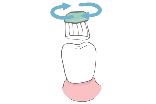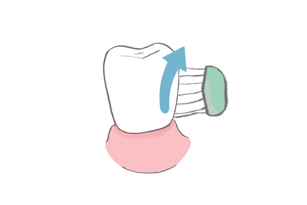 | 磨き方 | 歯と歯ぐき(歯肉)の境目に対して、斜め45°の角度でブラシを当てる | 歯ブラシの毛先を歯に平行に当て、毛先を歯肉に軽く押し当てるようにする | ブラシで歯を1本ずつ包み込むように磨く |