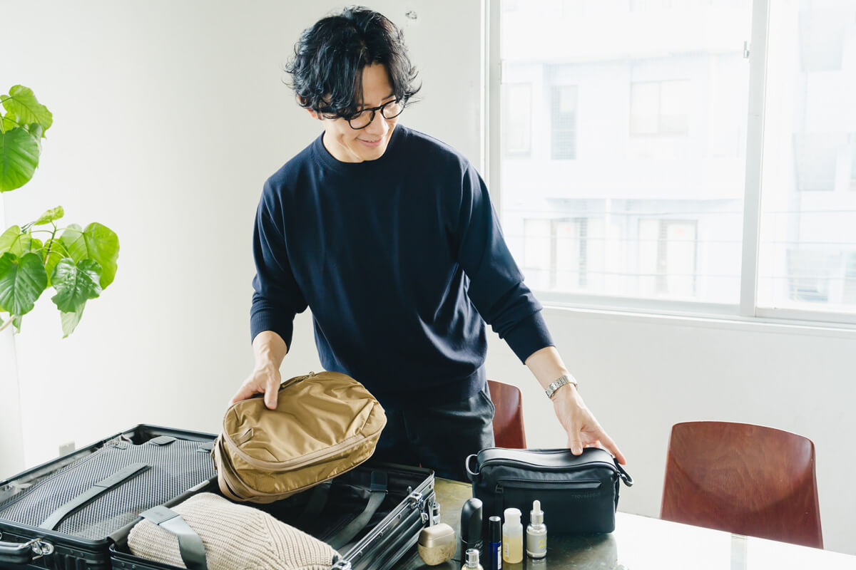 出張時のバッグの容量は限られています。実際に櫻井さんのパッキング事情を伺うと、枕を持参するために中サイズのスーツケースを選んだり、荷物の隙間を埋められる調整可能なポーチを使ったりと、スペース効率を意識しているのだとか。