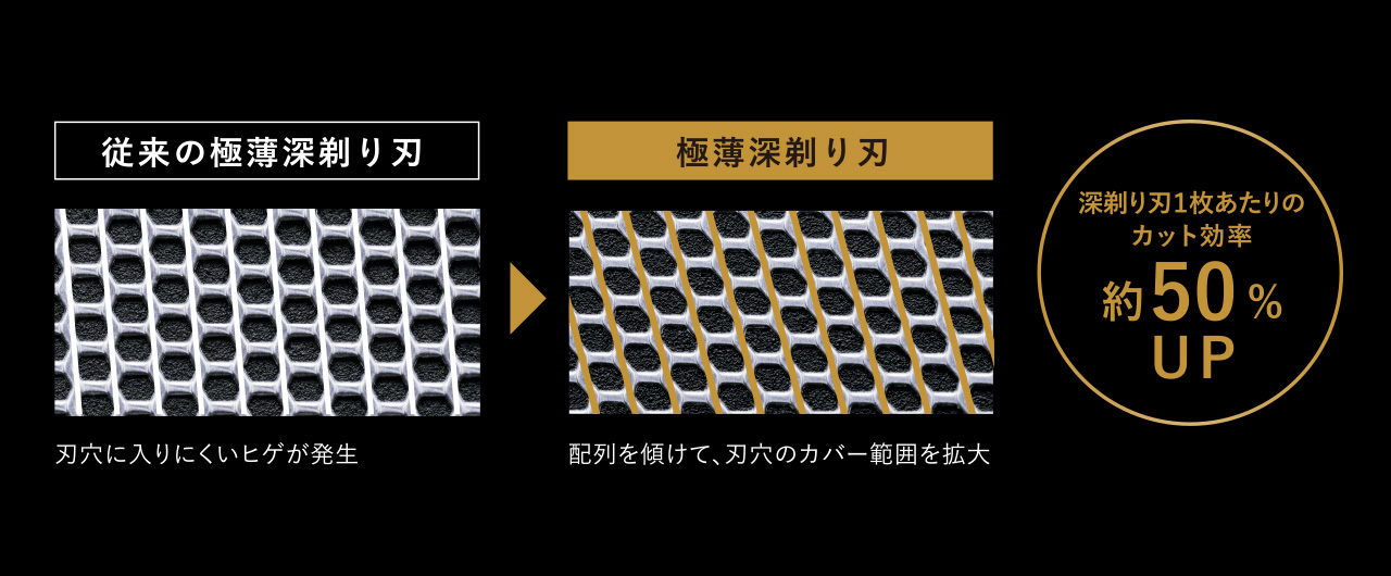 5枚刃システムは、2枚の「アゴ下トリマー刃」、3枚の「極薄深剃り刃」で構成。アゴ下の厄介な寝たヒゲや、休日の間に伸びてしまった長いヒゲも、考え抜かれた刃穴がサッとすくい上げ、効率良くカットしてくれます。その機能性は世代が進むごとに進化していて、2023年の先代モデルと比較して、深剃り刃1枚あたりのカット効率は約50%向上※しています。