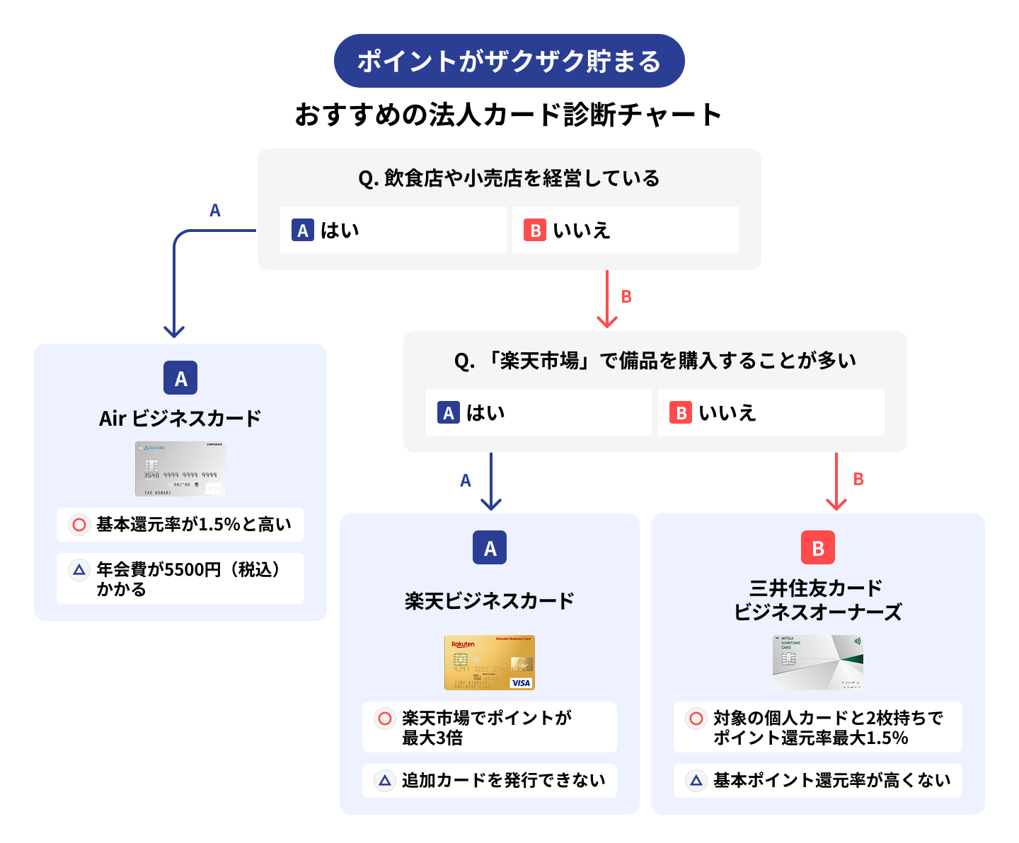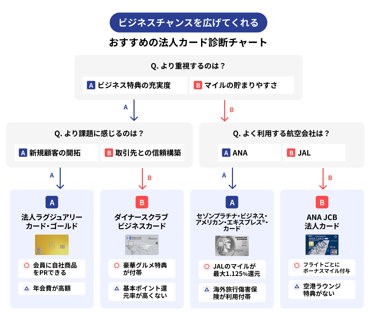 さらに、各パートごとに、自社にあったカードが簡単にわかる診断チャートも用意しているので、どれを選べばいいか迷った際はぜひ参考にしてください。