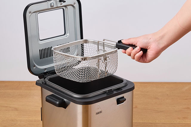 柔らかいスクエア型のデザインが、スタイリッシュでいいですね。フタを閉めて油はねを防ぎながら調理できたり、バスケットで細かな揚げ物を手軽に揚げられたり、使い勝手も良い商品だと思います。