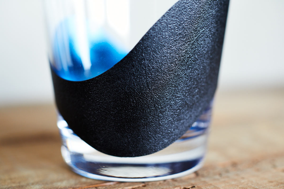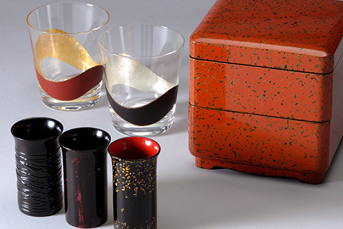 しかし、一部の職人は、品質向上や名声維持のため努力を続け、終戦後の昭和34年(1959年)には、静岡漆器協同組合(現在の静岡漆器工業協同組合)を組織し、結束して駿河漆器を支えてきました。その中の一つが鳥羽漆芸です。鳥羽漆芸は、近年では伝統的な漆器だけでなく、新しい形の漆器の提案を積極的に行っています。今回紹介するガラスに漆を塗った「うるしのGLASS」シリーズは特に人気の高い逸品です。