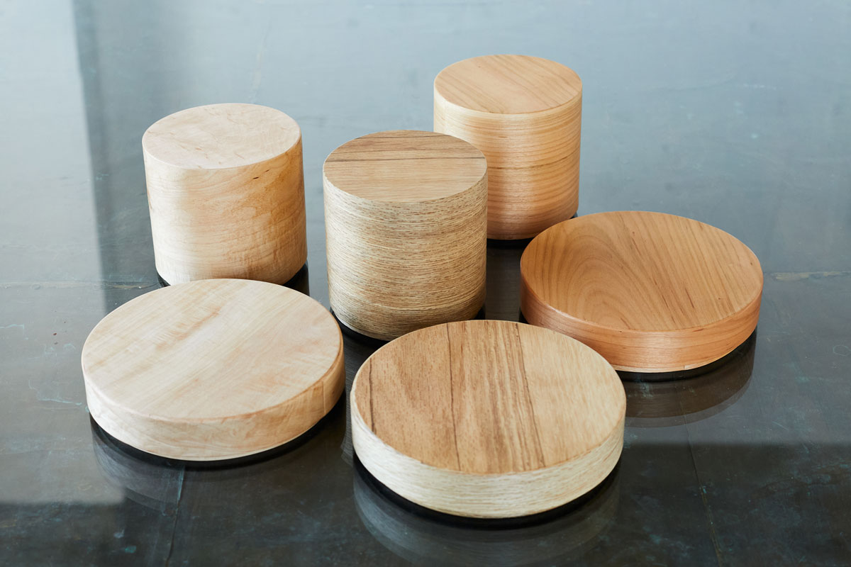 支障木は、管理されずに自由に育ったからこその特徴的な木目や表情があります。また、反りやうねりが強く機械加工が難しく均一な製品には向きません。「支障木プロジェクト」では、それらを個性として再定義し、ひとつとして同じものがないことを魅力として伝えています。その代表的な製品が、わっぱのケースです。平型と筒型で、それぞれ樫(かし)、桜、カエデの天然木を使った3種類があります。それぞれの木目や木肌を生かし、着色をせずに仕上げられています。