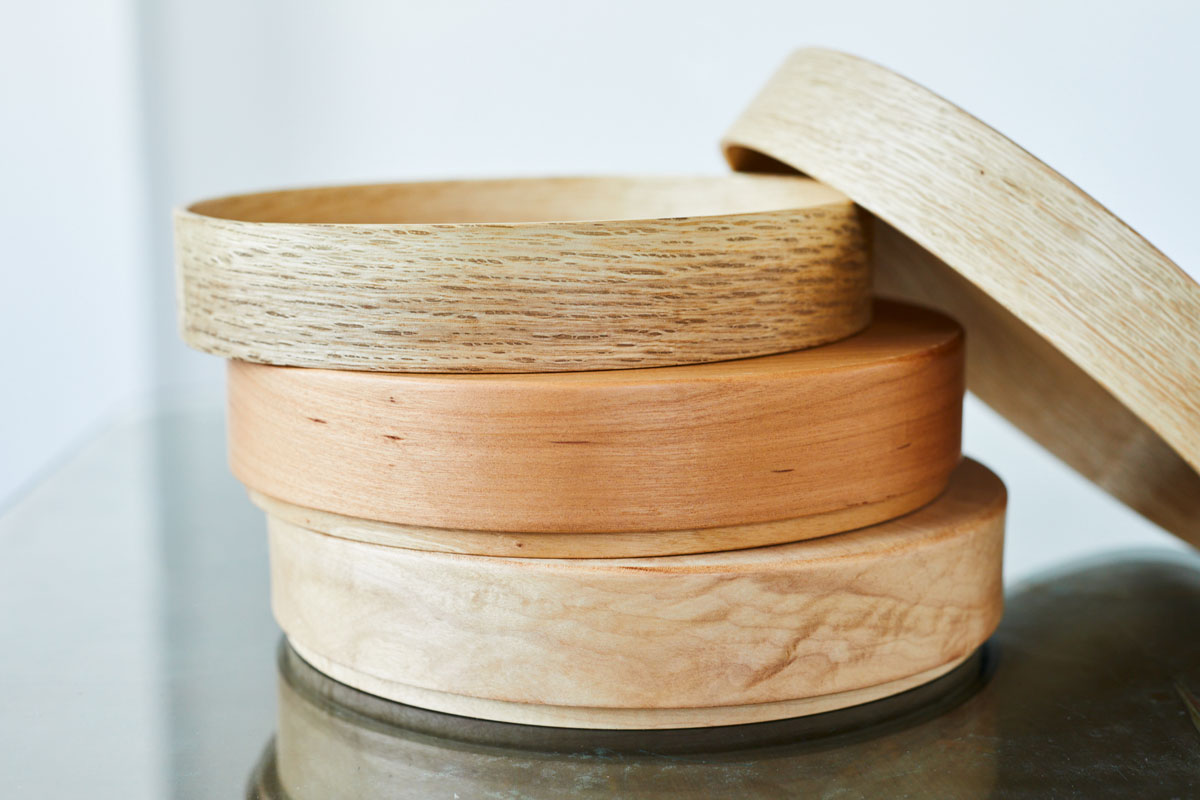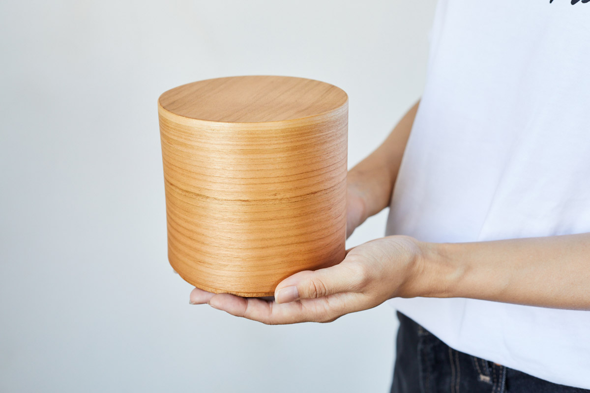 薄い木地のわっぱの入れ物があってもおもしろいのではないかという発想から、サイズや形状を試行錯誤して完成したわっぱケース。日常に溶け込むニュートラルなデザインは、まるで木そのもののよう。自然と支障木ならではの唯一無二の表情に目が向きます。