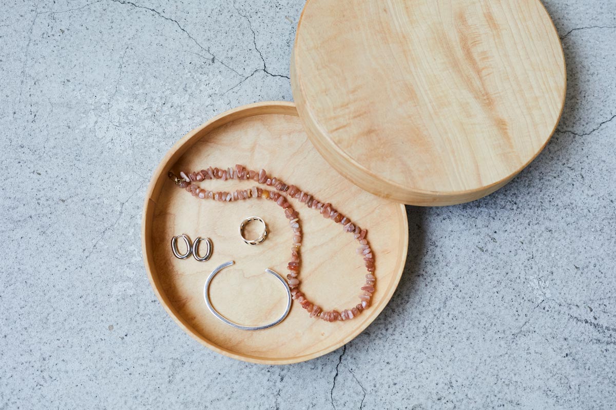 「わっぱのケース平型」は、幅と奥行きが18cm、高さが3.6cmとちょっとした小物を入れるのに最適なサイズ感。アクセサリーや腕時計、鍵など、毎日使う小物をまとめておく“見せる収納”として使うのもおすすめです。木のぬくもりと丸みのあるかたちは、置いてあるだけで空間をやさしく整えてくれます。