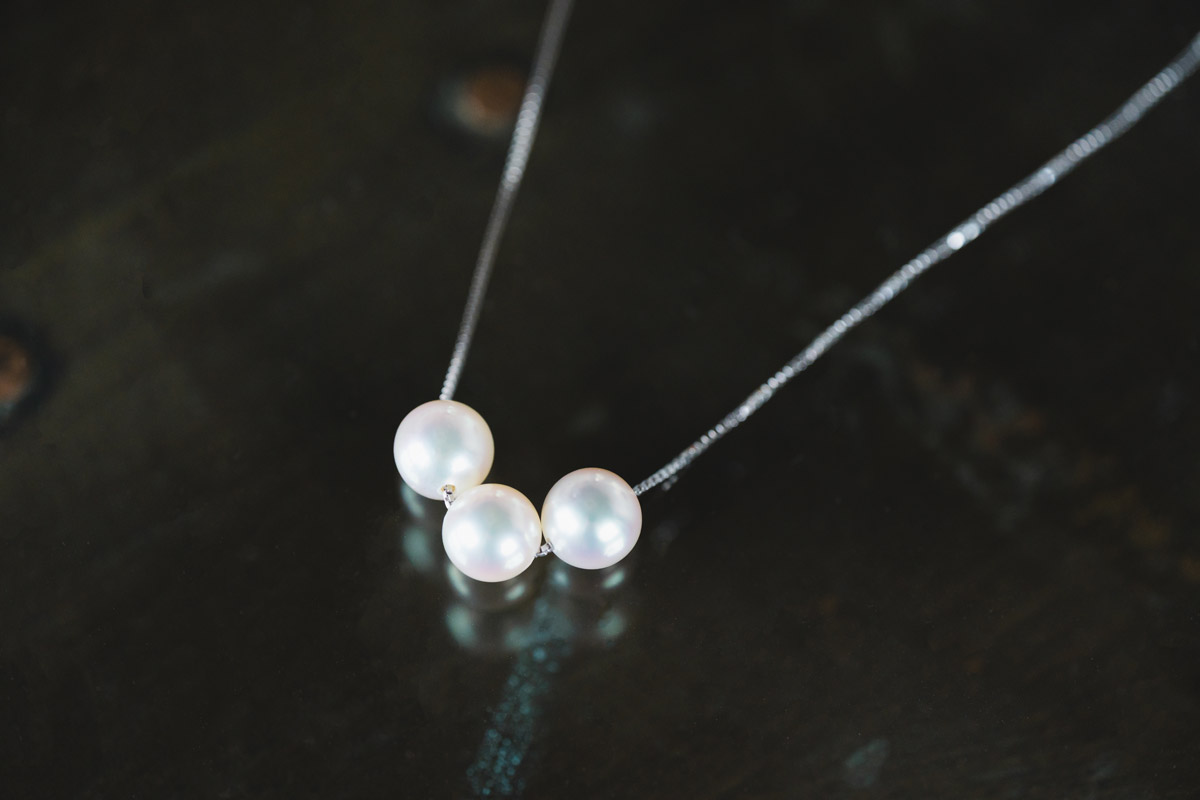 写真は、「プチ3 宇和島産あこや真珠 3粒スルーネックレス」。宇和島産あこや真珠を、3粒並べてシンプルに仕立てています。7.5mmまたは8.0mmの珠から選べ、ホワイト系・ピンク系・ブルーピンク系の3カラー展開です。
