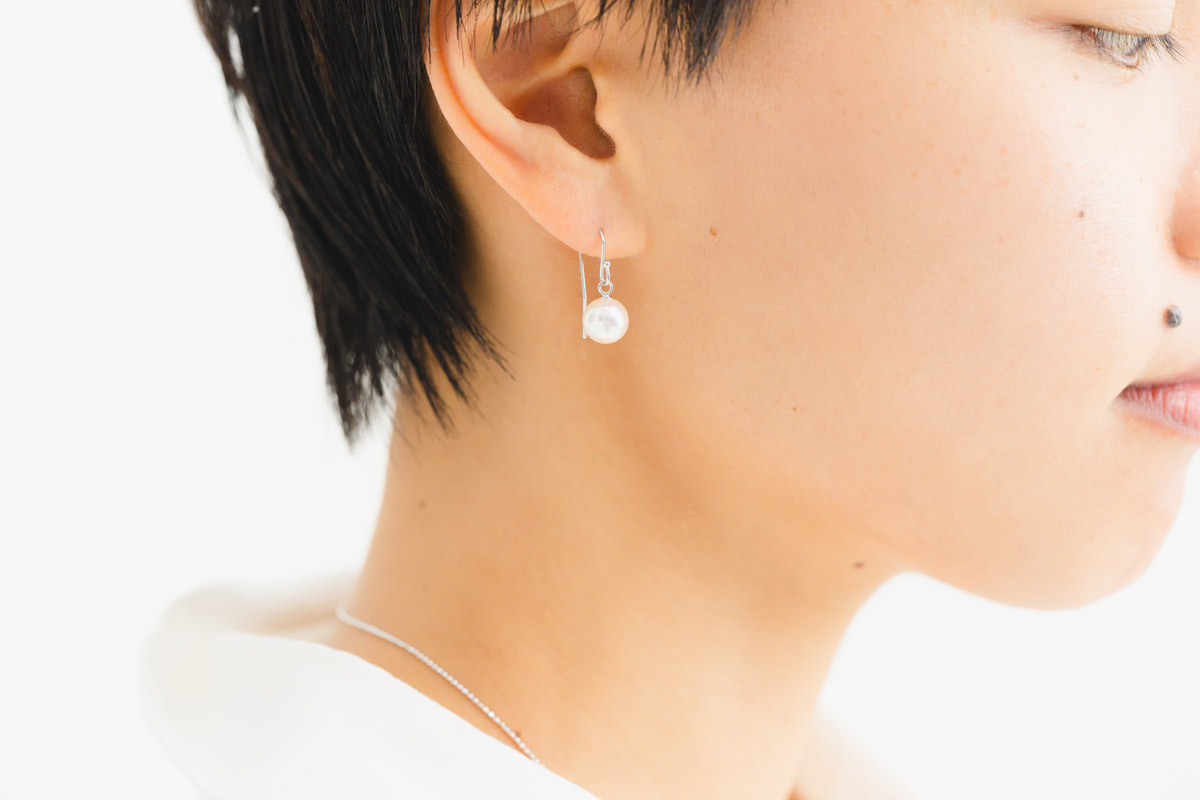 一方、無駄のないシルエットと、やわらかに光るあこや真珠が魅力の1粒ピアス。職場でも、プライベートでも品よく映えるデザインで、フォーマルな席にもカジュアルな装いにも自然になじみます。毎日の装いに取り入れやすく、長く愛用できる万能な一品です。