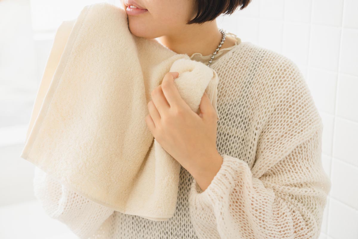 「潤いのタオル ファンデーション」シリーズは、トレンドのくすみカラーが魅力。女性の“あったらいいな”という声から生まれた、肌も心も潤すような一枚です。空気をたっぷり織り込んだ軽やかな風合いは、驚くほどふわふわでやわらか。洗濯を繰り返しても硬くなりにくく、やさしい肌ざわりが長く続きます。