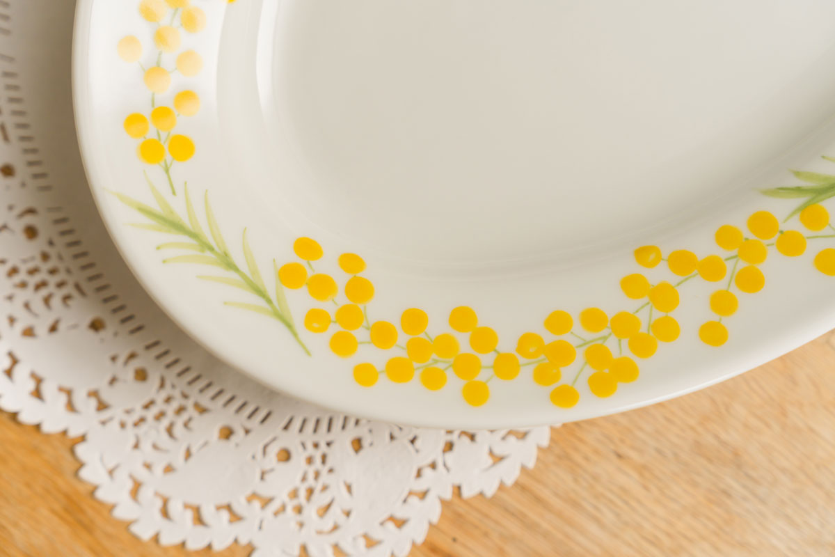 一枚一枚、職人の手で絵付けされるため、それぞれに異なる表情があり、手しごとならではの温もりを感じられるのも魅力。砥部焼特有の厚みと、わずかに青みを帯びた白磁の清らかさが、ミモザのやわらかな黄色をよりいっそう引き立てています。