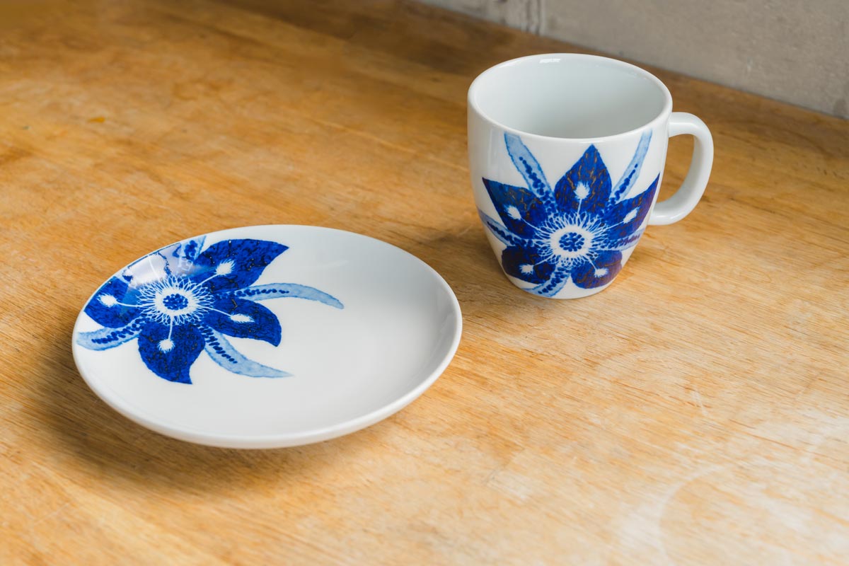 明るい黄色が印象的なミモザシリーズと対をなすように、静謐な青で描かれた「カトレアシリーズ」も。砥部焼ならではの白磁に映える深い青が、花びらのやわらかな曲線を引き立て、凛とした美しさを宿しています。