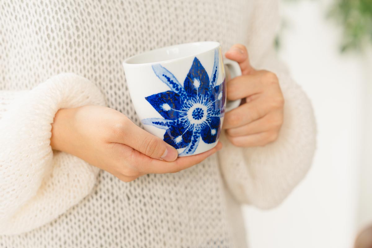 気品あるカトレアの花を、淡くにじむ青の濃淡でていねいに表現。一枚一枚、職人の筆から生まれる手描きのタッチが、花の瑞々(みずみず)しさと奥行きを感じさせます。静けさの中に凛とした存在感を放つそのデザインは、ミモザの温かみとは対照的に、洗練された印象をもたらします。