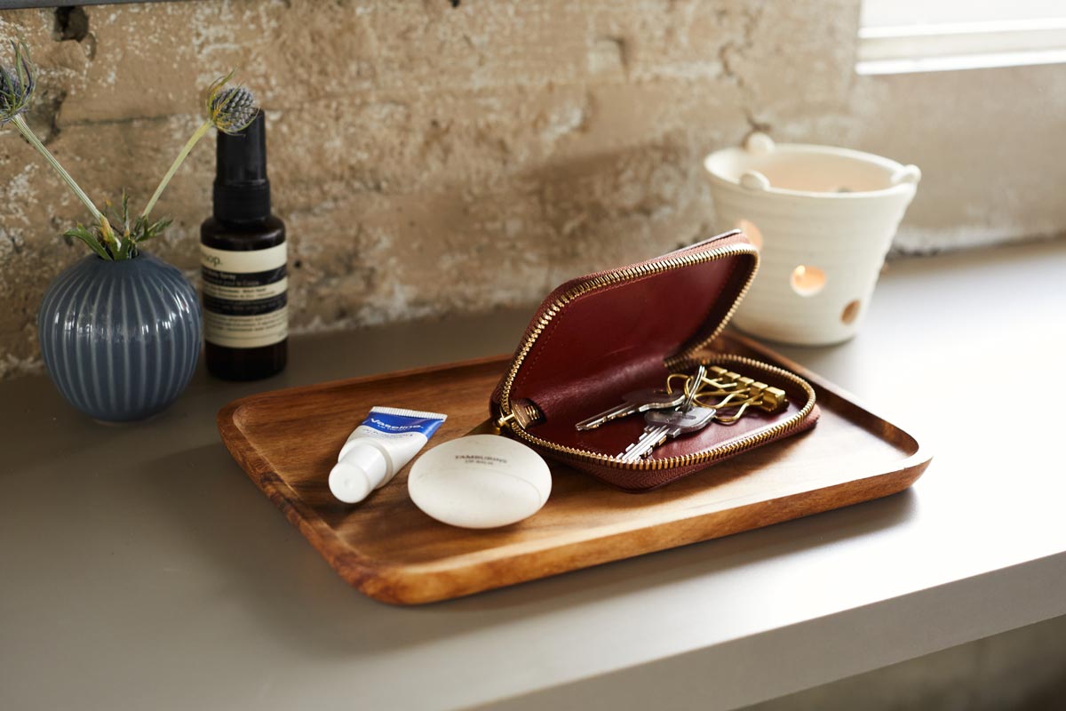 植物タンニンでじっくりなめした上質なピットヌメ革を、熟練の職人がていねいに仕立てたキーケース。YKK「EXCELLAⓇ」ファスナー採用で開閉もなめらか。鍵やカードを整理して持ち歩け、ポケットにも収まるスマートな逸品です。カラーは「Red Brown」のほか、「Black」「Deep Blue」「Green」「Camel」の5色展開。サイズは高さ12cm × 横7cm × 奥行き2cm。