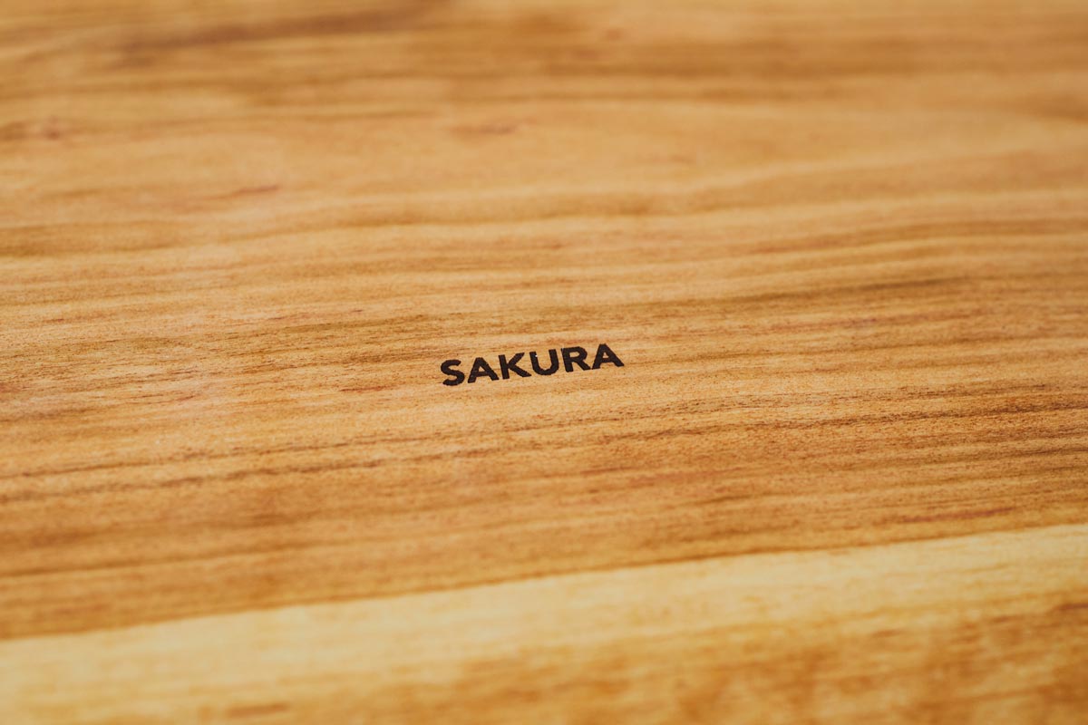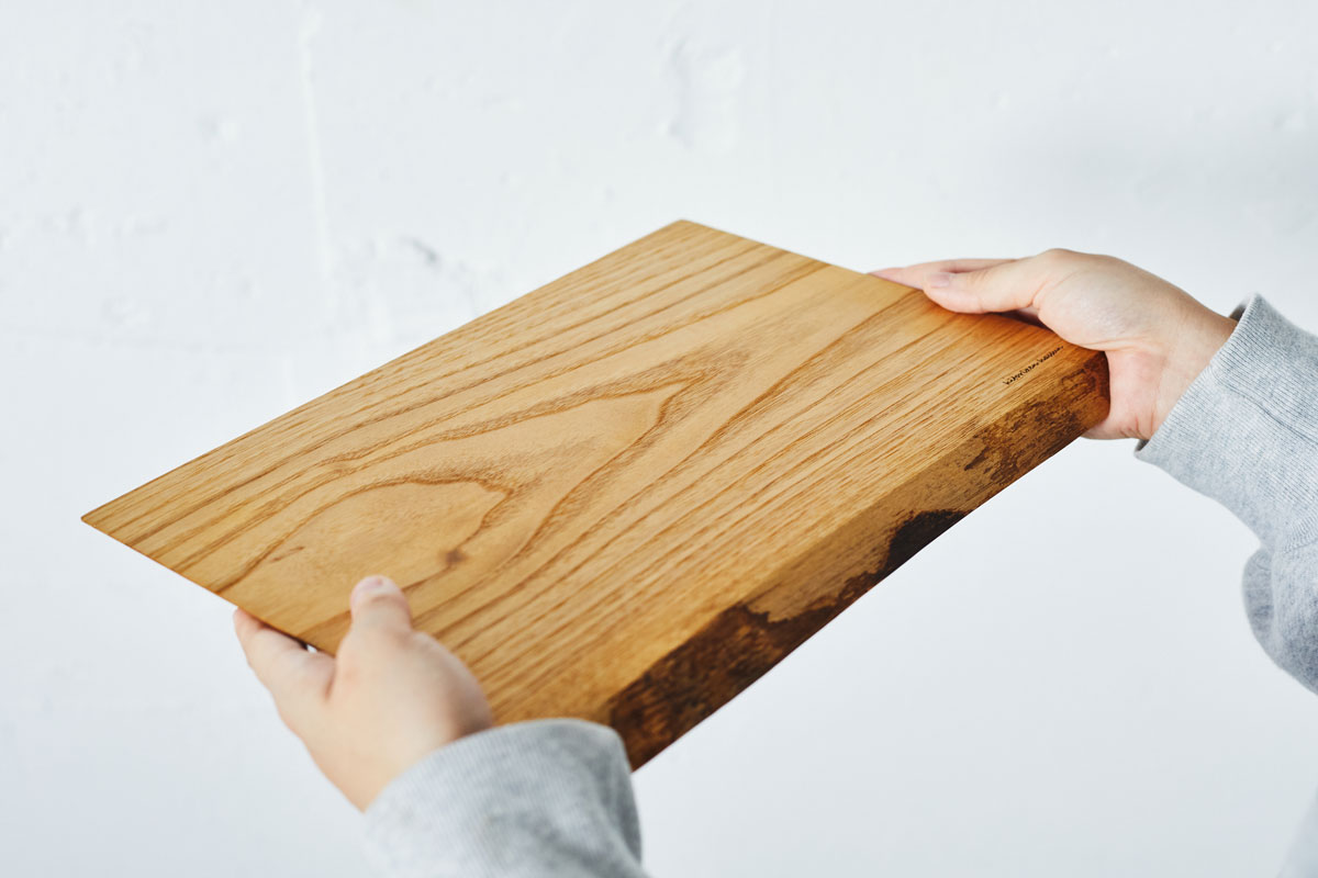 使用する広葉樹は、「クリ」「ケヤキ」「サクラ」など。クリは落ち着いた褐色と耐久性、ケヤキはきめ細かな明るい木肌、サクラはほんのり赤みを帯びた柔らかな風合い。樹種によって色、木目、質感が大きく異なり、その個性を生かしています。裏面には、樹種が彫刻されているので、どの木でつくられているのかが一目でわかり、使うたびにその木の物語に触れられる——そんな小さな楽しみも添えられています。