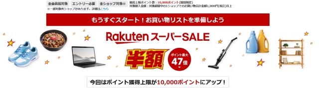 楽天市場のセール「楽天スーパーSALE」が3月4日(水)20:00から3月11日(水)01:59まで開催されます。半額商品や割引商品が目白押しで、多くの商品がお得な価格で購入できます。
